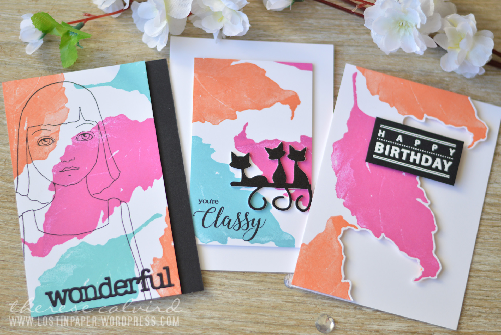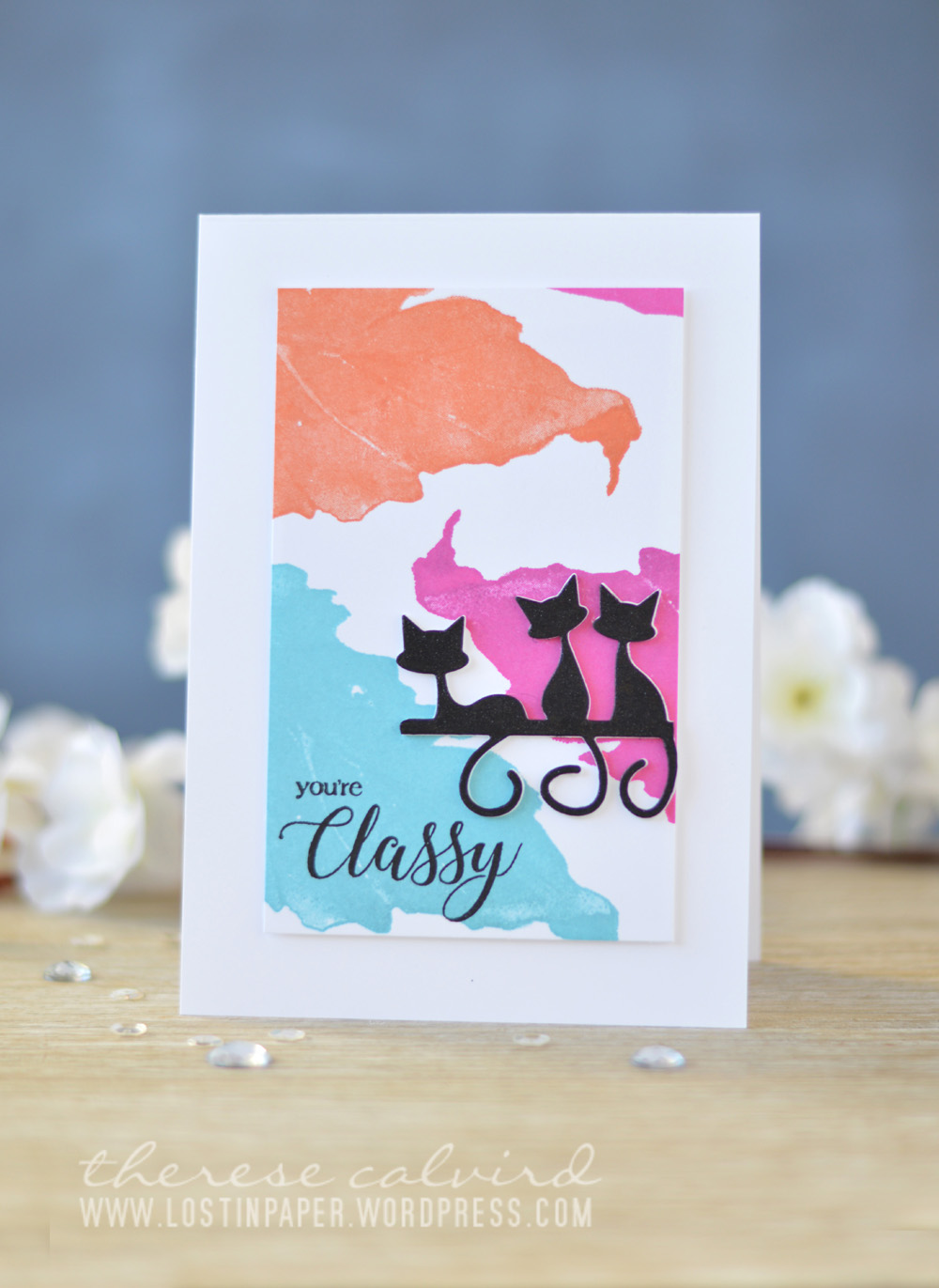 What a fantastic tropical colour palette for that artsy leaf background, Therese … it’s gorgeous … and every single card is brilliant! I was especially taken with the cats … classy indeed! Hugs, Anita 🙂