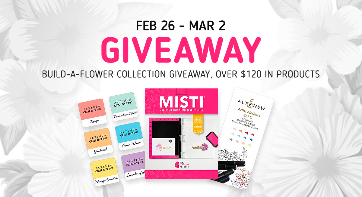 Place an order from the Build-A-Flower Collection from 2/26/2018 until 3/2/2018, and you will automatically be entered into a raffle for a chance to win a big prize! One lucky winner will be chosen to win a prize pack valued at over $120 including one Original MISTI stamping tool, Artist Markers Set C, and Soft Pastel 6 Mini Cube Set. No minimum purchase needed! A winner will be announced on March 4th on the Altenew Blogs.