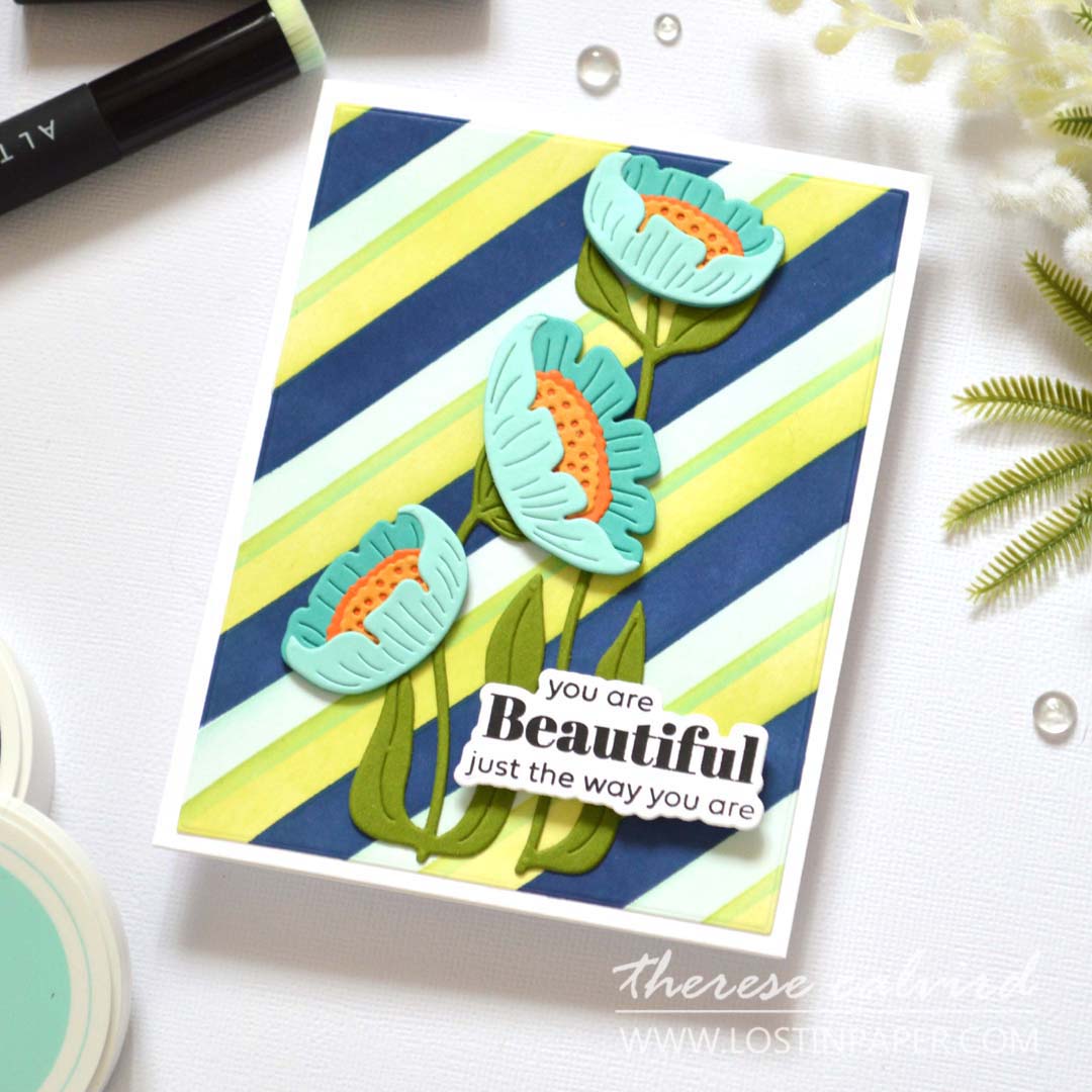 For this card, I kept my stencil on the same angle, but overlapped my inks to create a new blended stripe of color. It’s such an easy way to add depth and a little surprise to a simple background.