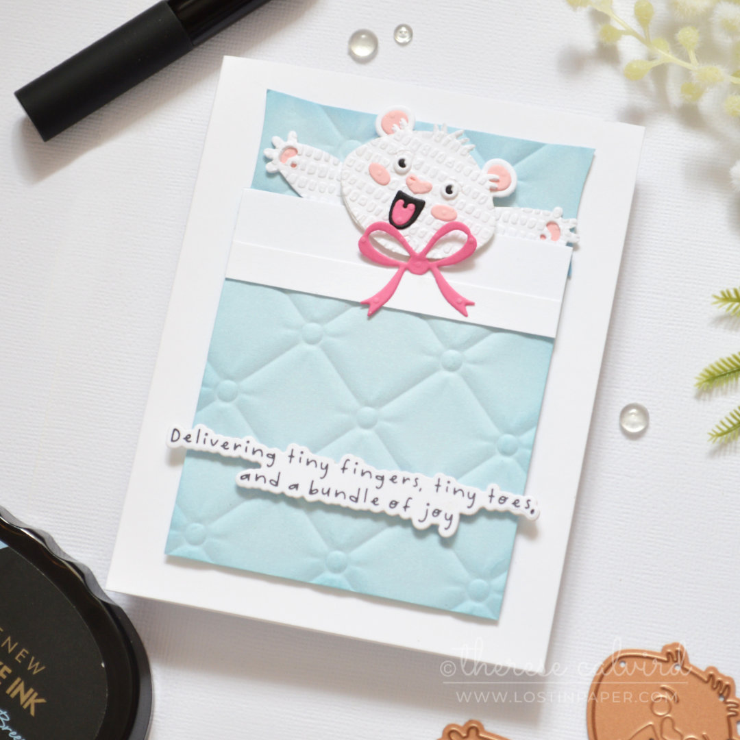 Lately, I’ve been enjoying revisiting old favourites and exploring embossing folder card ideas (watch more on the playlist here), and this card came together by letting texture do the heavy lifting. I’m using one embossing folder to create a soft, quilted bedding look and another to add a furry texture to the bear – simple choices that completely change the feel of the card.