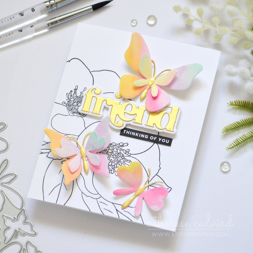 To step it up a notch, I brought in brushed gold cardstock, tying it together with a coordinating die cut sentiment and gold accents on the butterfly bodies.