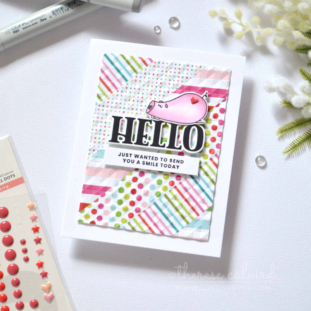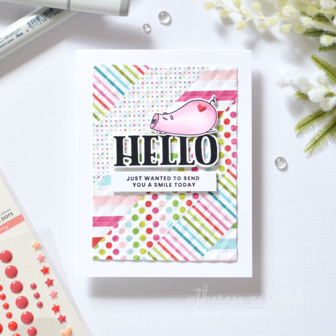 Scrap strip background card with embossed pattern and cute pig by Therese Calvird