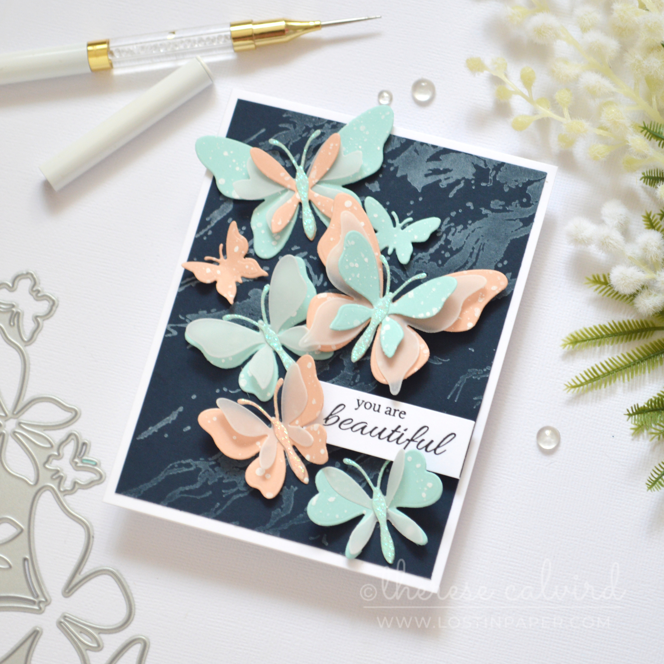 I added some white ink splatter to the die cut butterflies, then layered them in a mix of colours, vellum and a little glitter for shine. To help them really stand out, I created a dark, patterned background behind them.