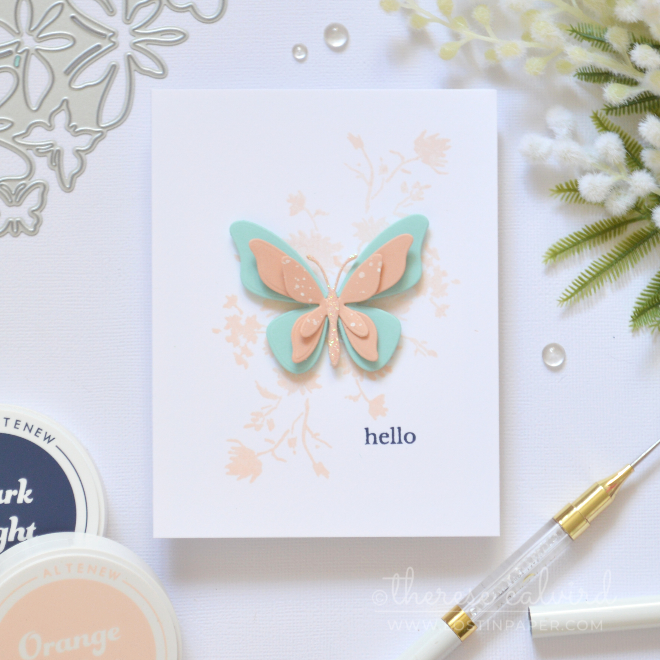 For this card, I went in a completely different direction and kept things clean and simple. I stamped a soft silhouette floral branch in the centre using the same pastel tones, then added a single butterfly popped up for a little dimension.